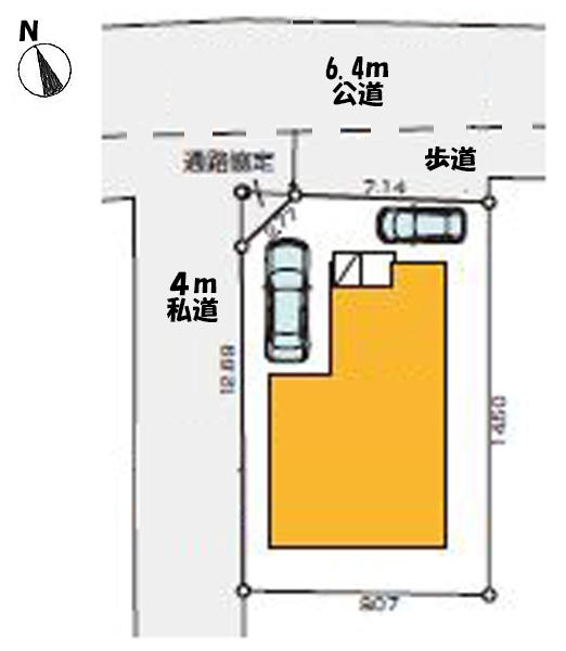 | 接道 | 北 6.4m(幅員) 公道 西 4m(幅員) 私道 |